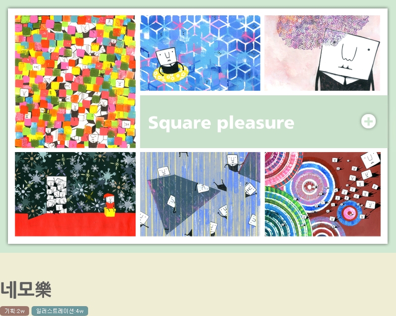 귀여운 네모인간의 즐거운 일상을 유니크하게 표현한 일러스트를 활용했습니다. 화려한 일러스트를