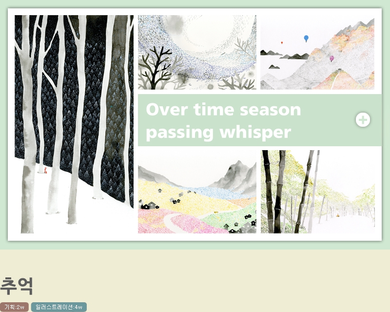 시간이 잔잔히 흐르는 계절을 지나가는 작은 속삭임, 작은 패턴들로 이루어진 풍경 속 기억의 흔적들은 아련한 추억을 떠올리게 합니다. 부드러운 먹과 수채화의 조합이 잔잔한 감동을 주는 일러스트입니다.